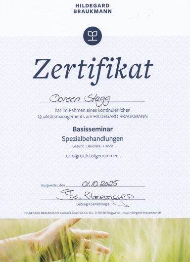 Ich bin Doreen Stugg, Fachwirtin für Ganzheitskosmetik und Wellness, mit zwei fundierten Ausbildungen im Bereich der Kosmetik. In meinem kleinen, aber feinen Studio lege ich größten Wert auf Hygiene, Qualität und eine persönliche, herzliche Atmosphäre.